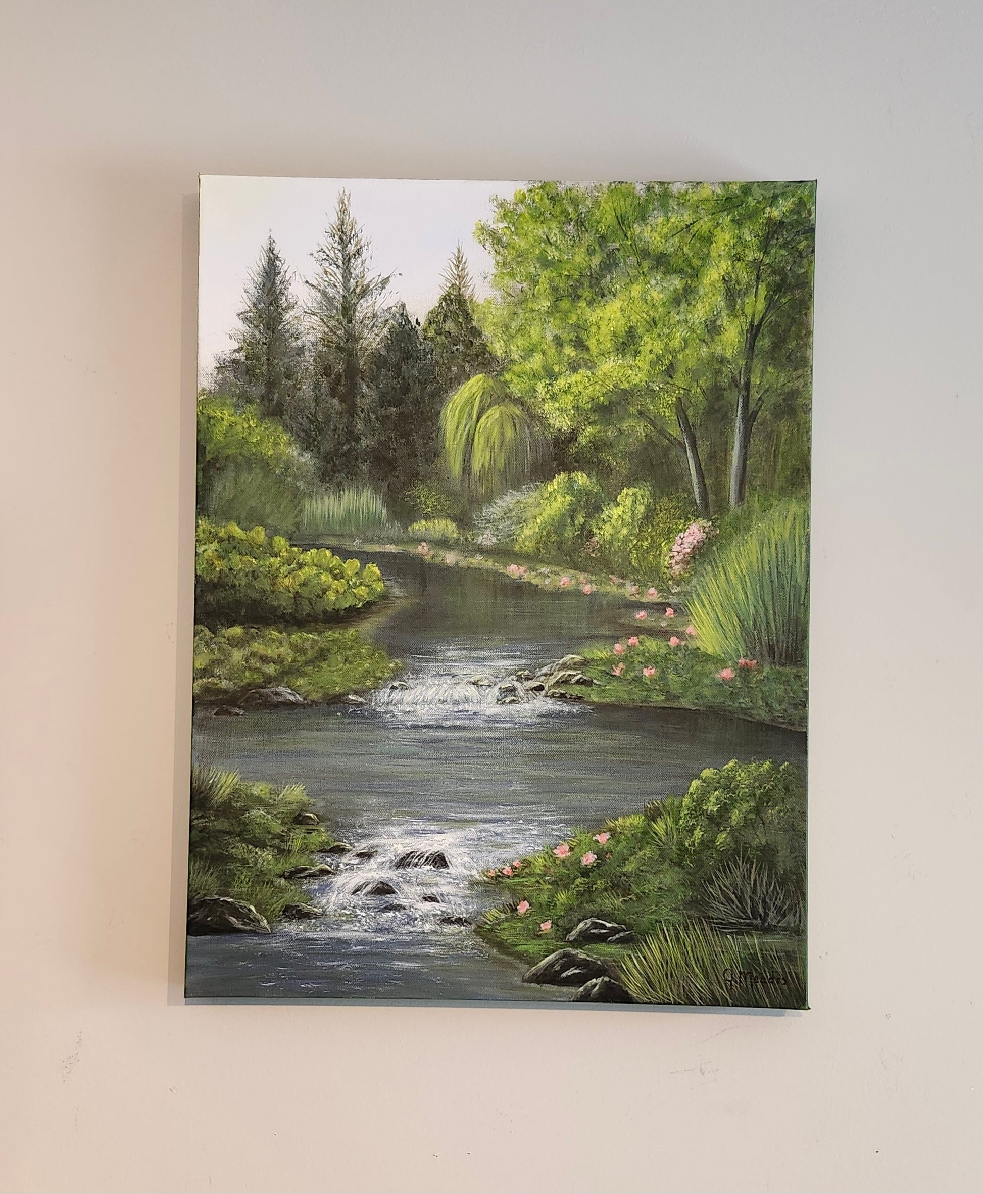 This summer scene painting is 18"x 24" on stretched canvas with a 1.5" wood frame backing.